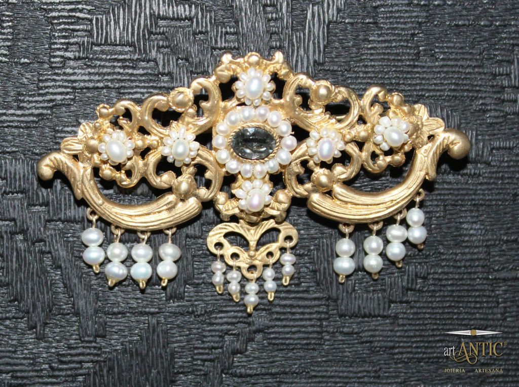 Se trata de un modelo balconet realizado en plata de ley chapado en oro y con elegantes piedras de swarovski color gris. Un aderezo muy especial para ella porque se involucró muchísimo en el trabajo de creación del mismo eligiendo especialmente el color de la piedra y añadiendo el remate de la joia y los pendientes. Un doble balconet lleno de detalle cuyas ornamentaciones están inspiradas en elegantes diseños del siglo XVIII.